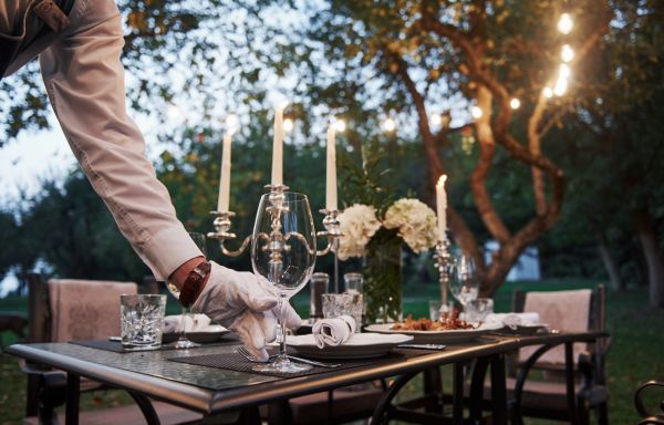 Vajilla Premium: Platos base, plato, tenedores y cuchillo, plato postre y cuchara postre, servilleta de tela