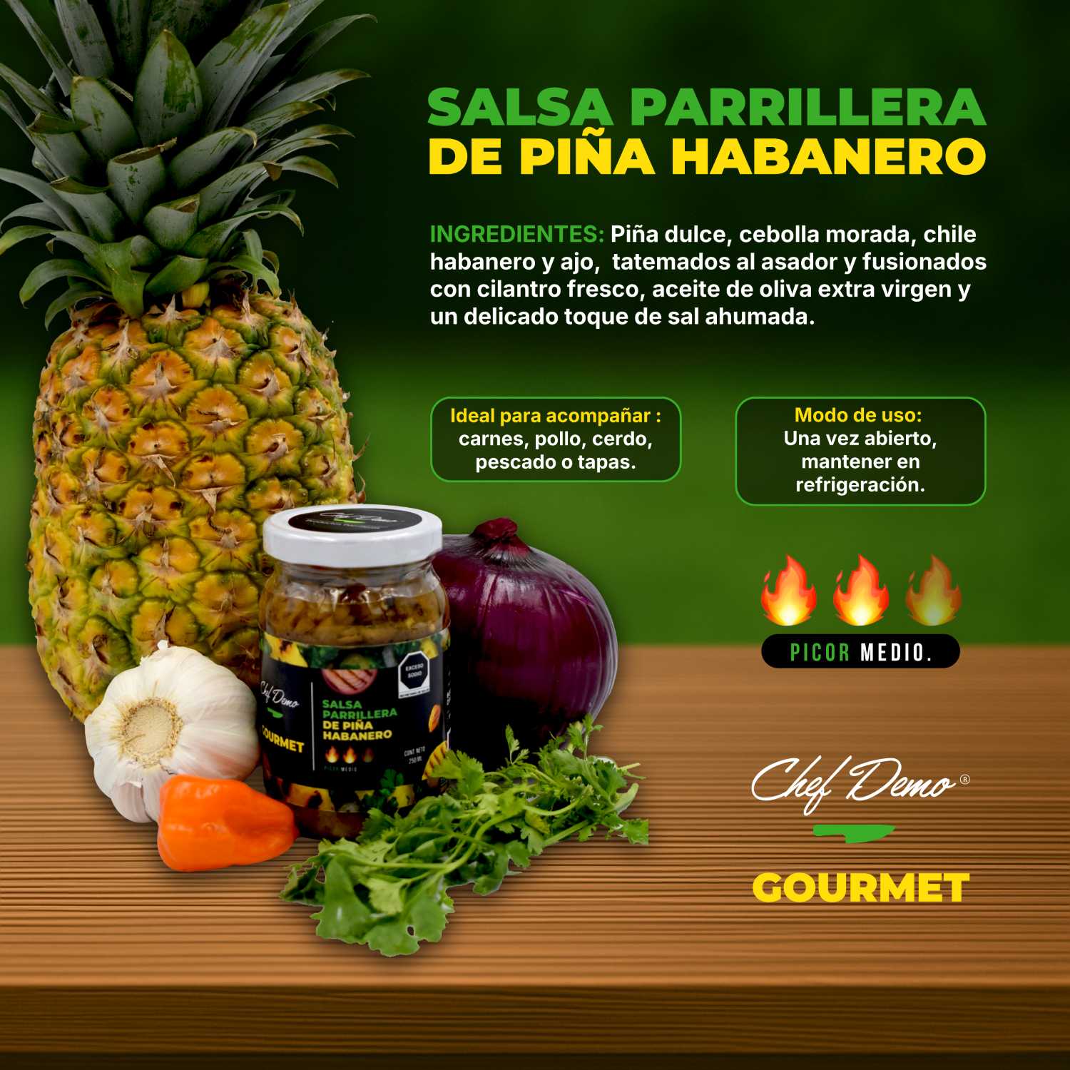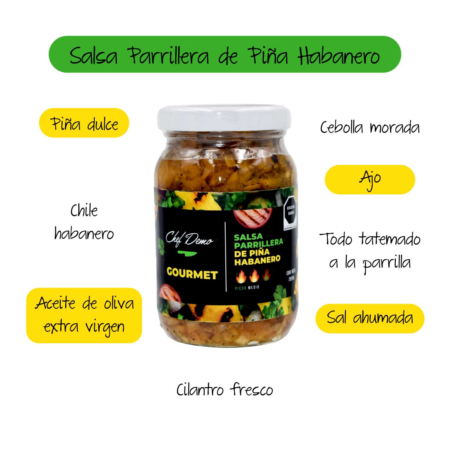 Piña dulce, Chile Habanero, Aceite de Oliva Extra Virgen, Cebolla Morada, Ajo, Sal Ahumada